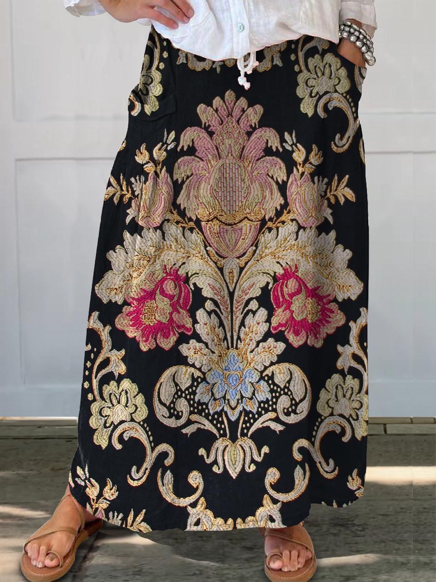 Women's Vintage Lovely Floral Art Print Casual Cotton Linen Pocket Skirt